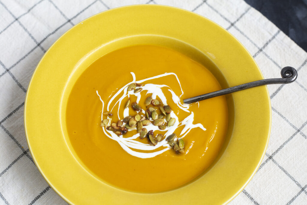 Kabocha squash and fennel soup with crème fraîche and candied pumpkin seeds