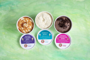 Current pint flavors are salted caramel, vanilla, and double chocolate, plus a seasonal flavor that you can only enjoy by the scoop—lemon olive oil. WIth more seasonal flavors to come!